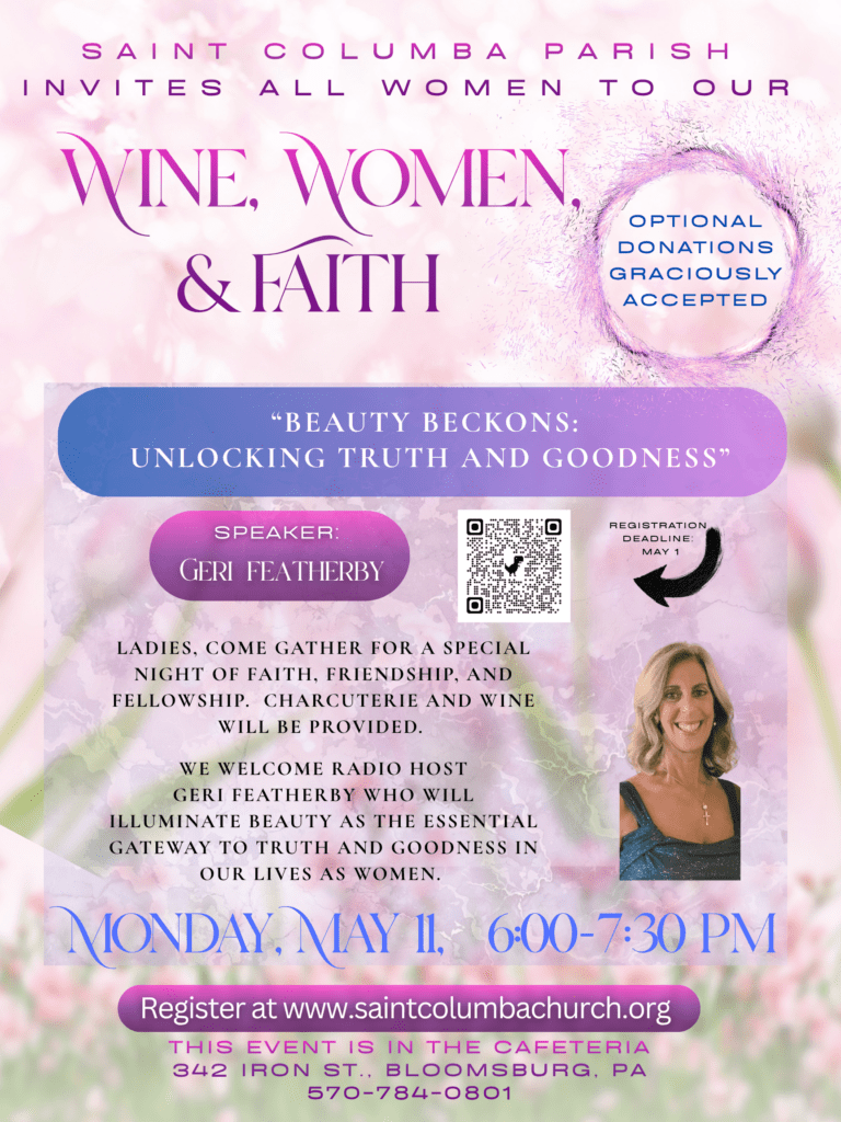 Ladies, you are invited to come gather for a special night of faith, friendship, and Fellowship. Charcuterie and wine will be provided. We Welcome Radio host Geri Featherby, who will illuminate beauty as the essential gateway to truth and goodness in our lives as women.